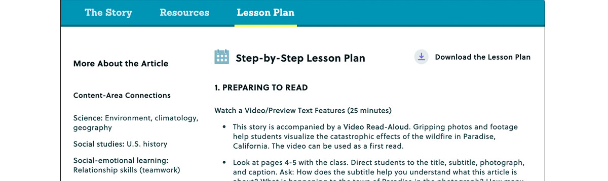 Think of these lesson plans almost like recipes – you’ll see the different skills the article targets, a list of teaching tools that are ready for you to use, and a guide you can follow for pre-reading activities, critical thinking questions that get at important ELA key skills, and culminating activities to reinforce learning.