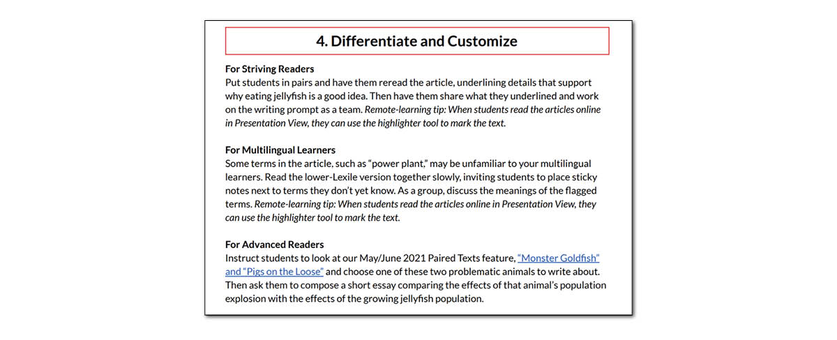 We know that no two students learn the same way, so we also offer differentiation and customization tips at the end of all of our lesson plans. This is where you’ll find alternate activities for small groups, multilingual learners, striving readers, and advanced readers.
