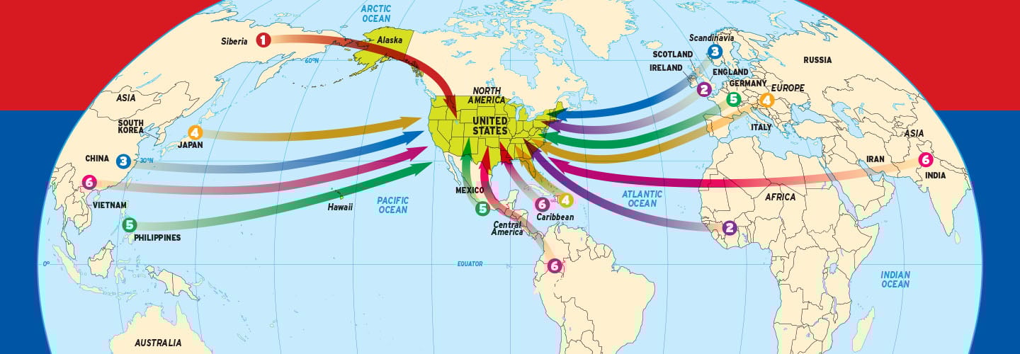 America’s story is a story of migration. People have long been coming to this land—mostly in waves. On the world map below, we’ve divided these migratory waves into six periods, from the first groups that crossed the Bering Land Bridge during the Ice Age to the tens of millions who have arrived since the colonial period and continue to come today.