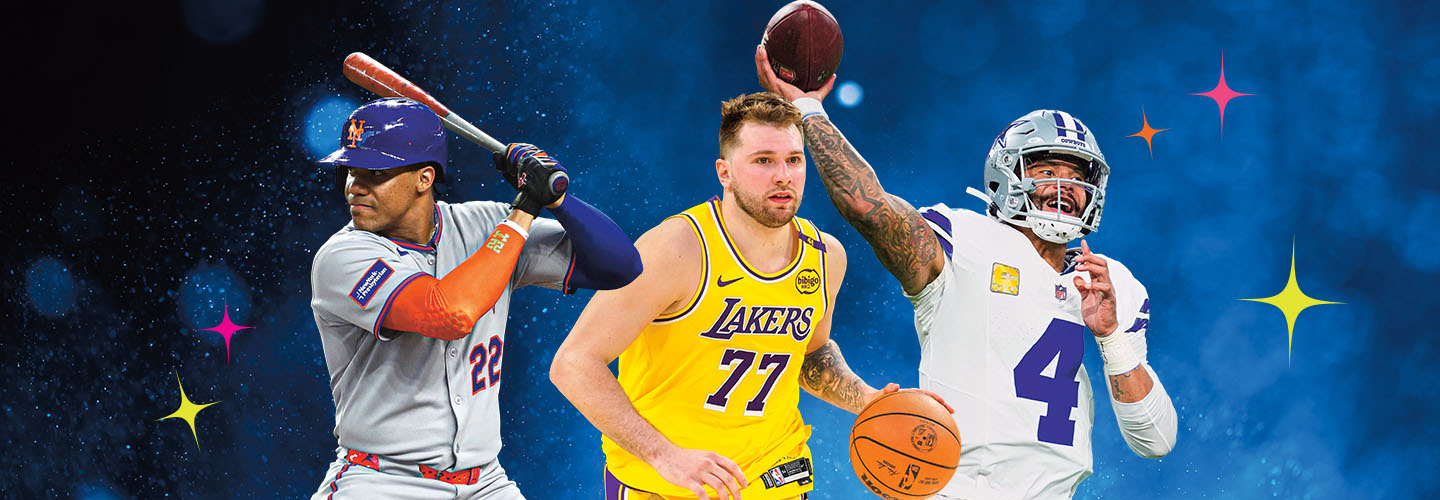 MLB: Juan Soto, New York Mets, 2025 Salary (left): $51 million; NBA: Luka Doncic, Los Angeles Lakers, 2025 Salary: $54 million (center); NFL: Dak Prescott, Dallas Cowboys, 2025 Salary: $60 million (right).  Shutterstock.com (Background); Tomas Diniz Santos/Getty Images (Soto); Harry How/Getty Images (Doncic); Cooper Neill/Getty Images (Prescott)