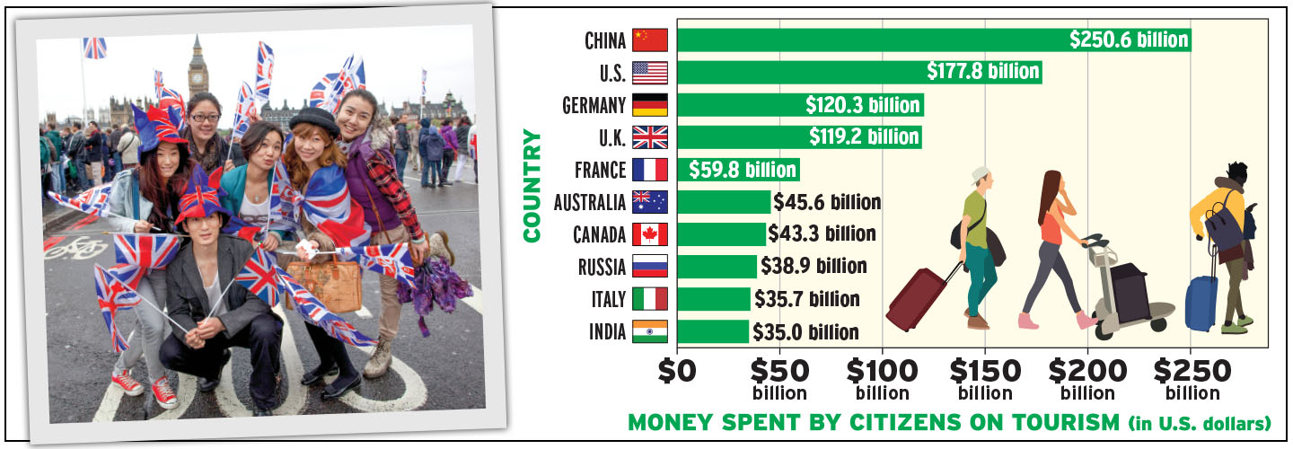 This graph shows which nation’s citizens spend the most money on international travel, according to the United Nations World Tourism Organization. Chinese tourists (above, in London) dropped about $250 billion last year, while U.S. travelers came in second at around $180 billion. Which country would you most want to visit?
